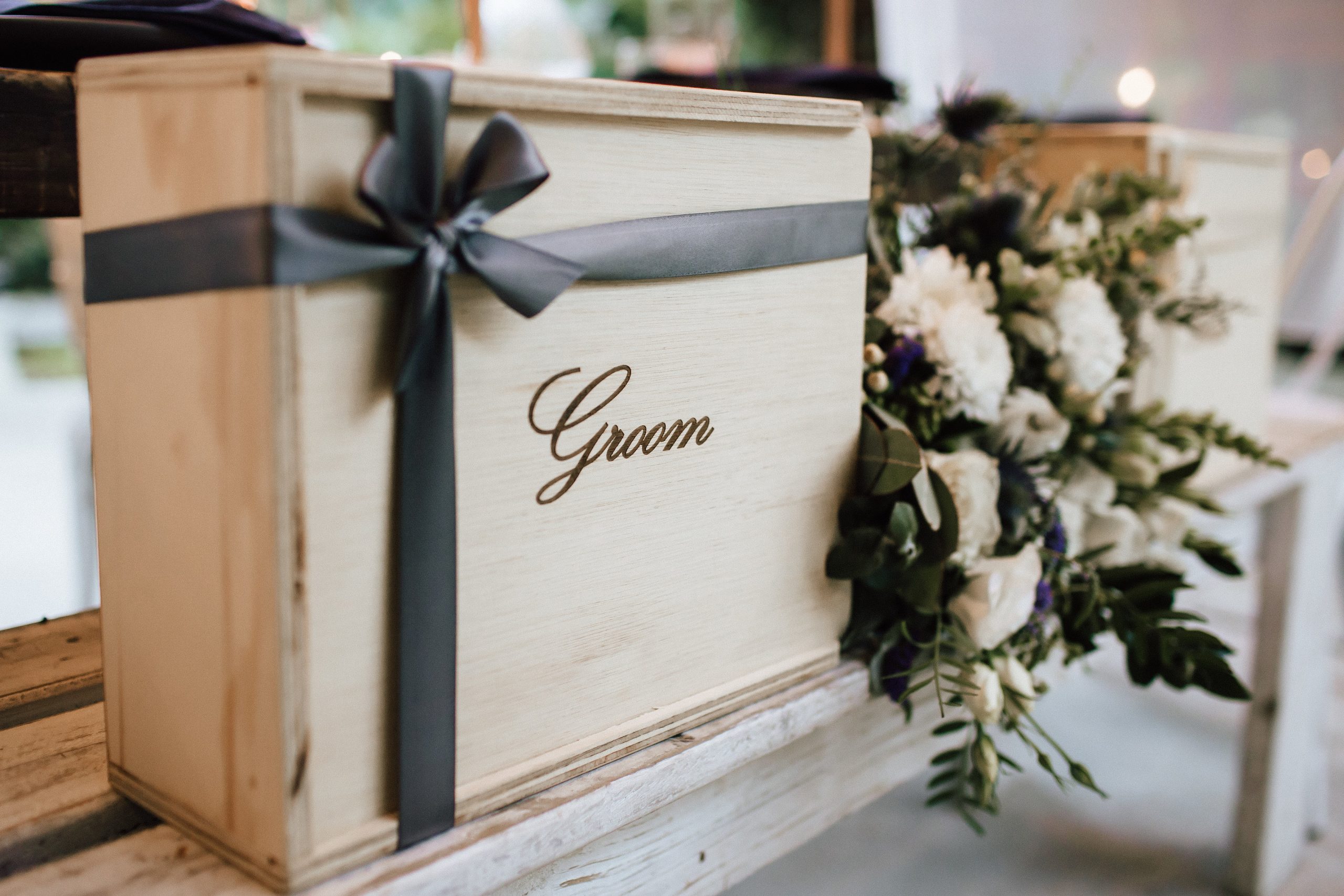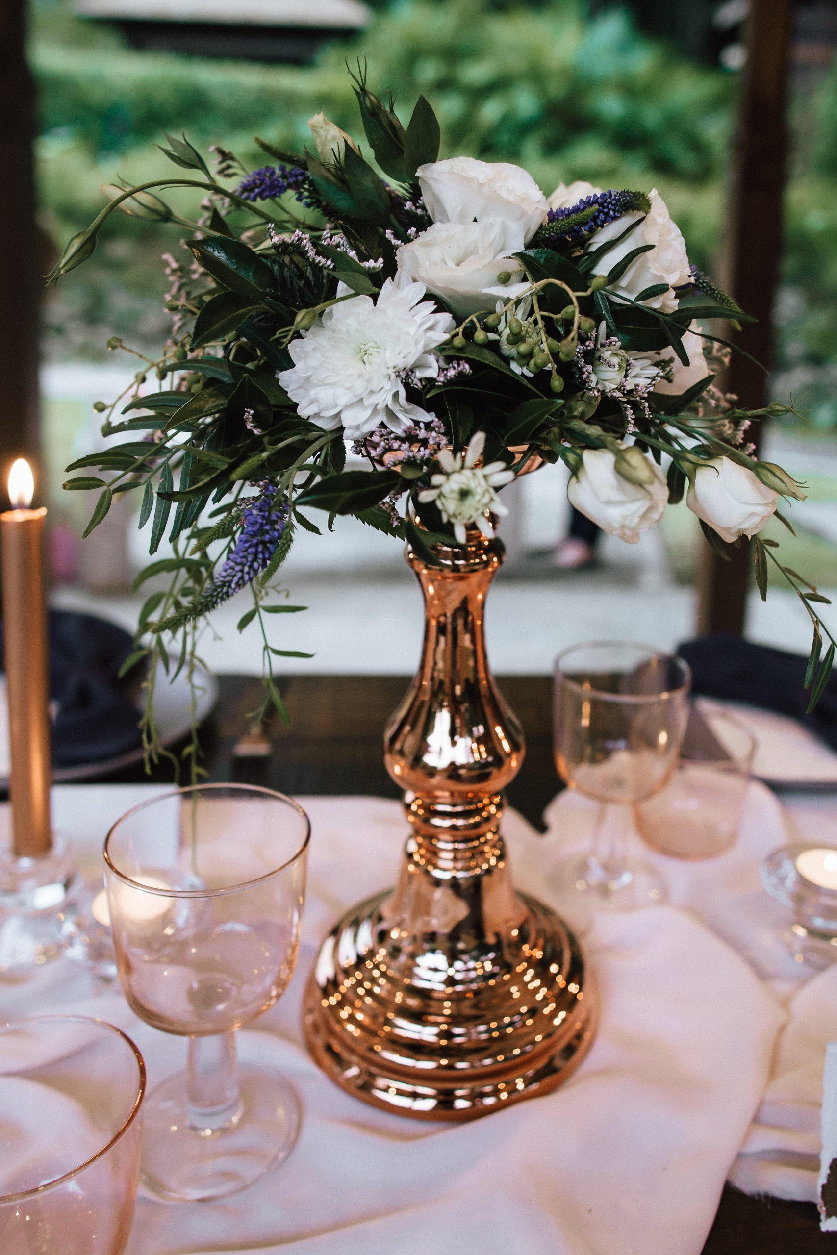 The navy hues spotted in the Groom’s attire and bouquet arrangements are carried through to the table styling by Emerald Aisle Events. Embracing the gorgeous greenery surrounds, styling was in keeping with the environment while adding some golden accents to natural wooden elements and crisp white runner matching the intimate, graceful feel of the bridal attire. Floral features by Lola’s Wildflowers provide the perfect finishing touches.