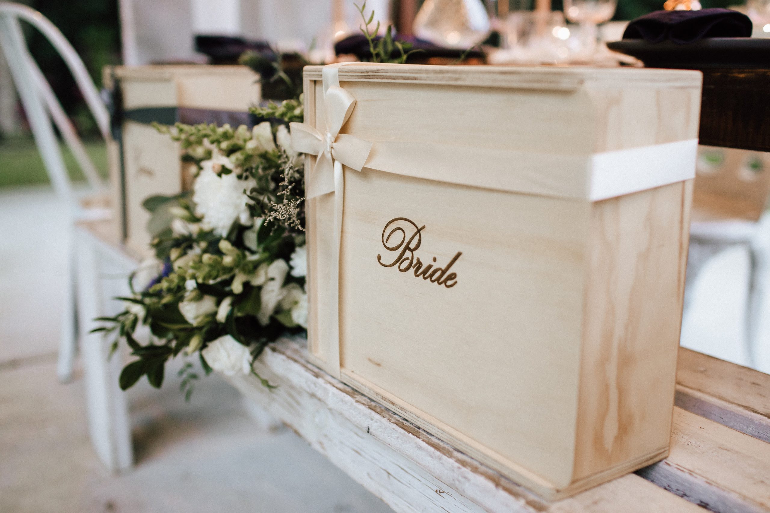 The navy hues spotted in the Groom’s attire and bouquet arrangements are carried through to the table styling by Emerald Aisle Events. Embracing the gorgeous greenery surrounds, styling was in keeping with the environment while adding some golden accents to natural wooden elements and crisp white runner matching the intimate, graceful feel of the bridal attire. Floral features by Lola’s Wildflowers provide the perfect finishing touches.