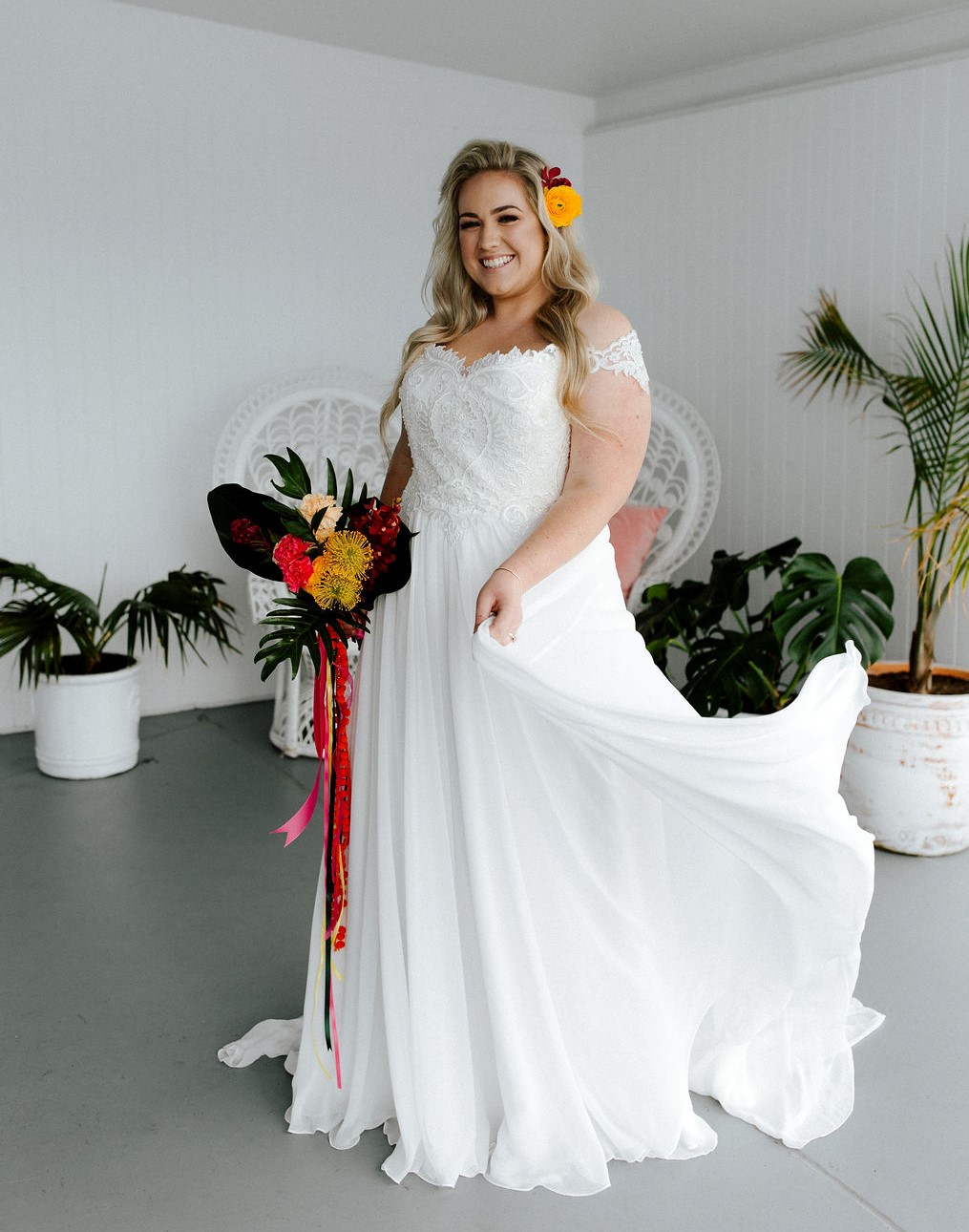 For Catherine, her gown was a reflection of her desire for versatility and elegance. She chose a stunning fit and flare dress from Karen Willis Holmes, its v-neck silhouette exuding timeless grace. For the ceremony, she added a Chantilly long-sleeved lace top, lending an air of ethereal romance. As the evening unfolded into a joyous celebration, she swapped it for a glittery belt, infusing her ensemble with a touch of fun and glamour.