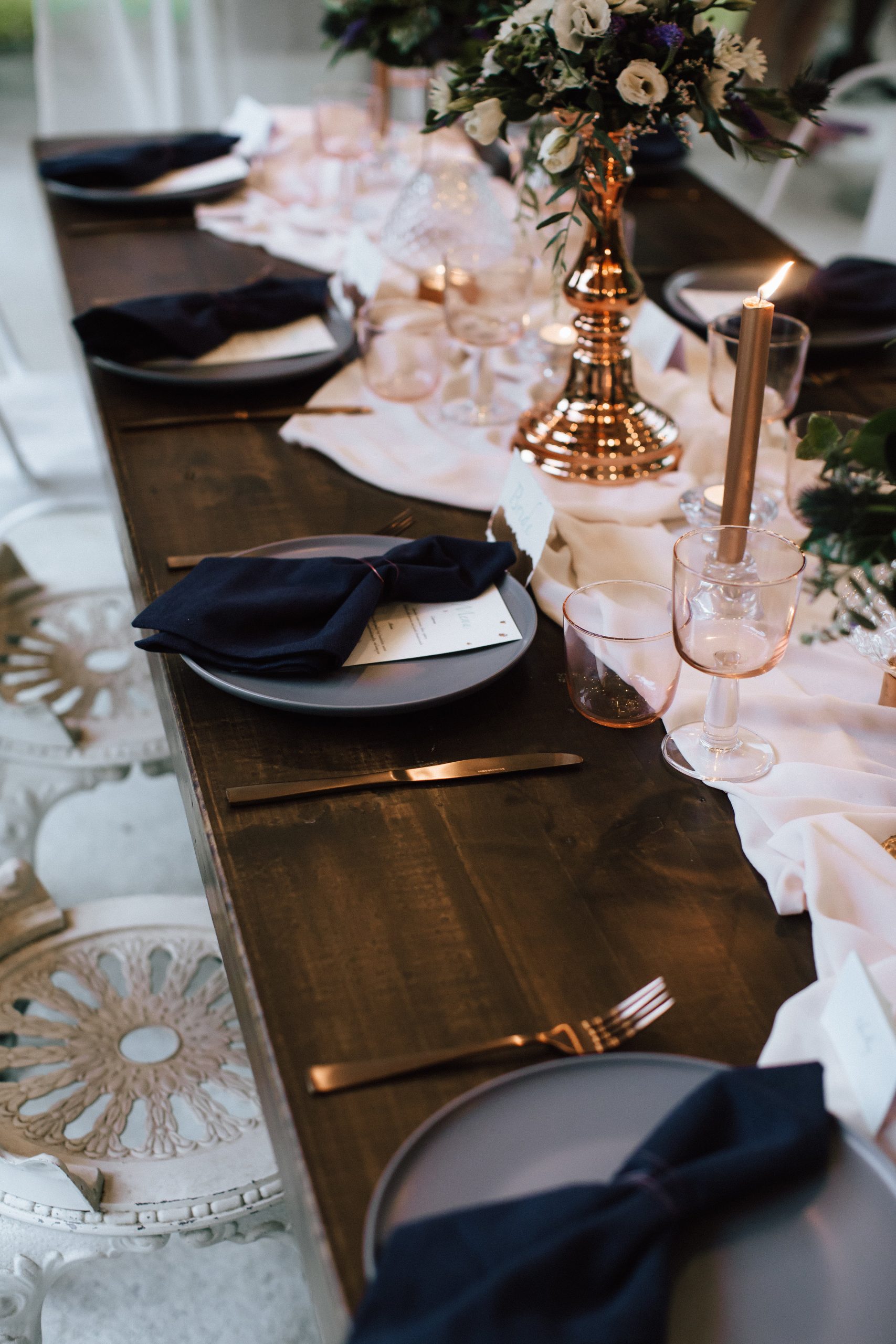 Following the ceremony, guests were invited to partake in a cocktail hour nestled within the cellar door. As the sun dipped below the horizon, casting a golden glow over the estate, the festivities moved inside The Book Barn, where guests were greeted by a sight that evoked the grandeur of a bygone era. Tables adorned with lush floral arrangements by Emma Blake Floral beckoned guests to take their seats, their dark, creamy tones adding a touch of mystery to the enchanting ambiance. Above, ceiling installations dripped with wild yet classic touches, casting a dreamlike spell over the scene.